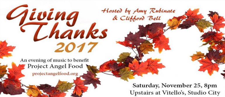 There is a wonderful concert taking place on Thanksgiving Weekend. On Saturday, November 25th there will be Giving Thanks 2017 An Evening of Music to Benefit Project Angel Food hosted by Clifford Bell and Amy Rubinate. The location will be Upstairs at Vitello’s, Studio City.