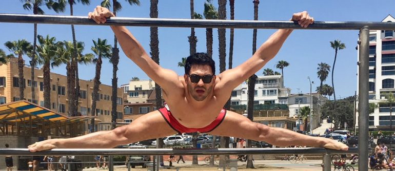When not at his daily fitness sessions at Gold’s gym in Venice, Alexander can be seen working out on Santa Monica Beach hiding behind his sunglasses and baseball cap, but still manages to catch the eye of curious passers by as he casually stretches in a full split on the work out frames.