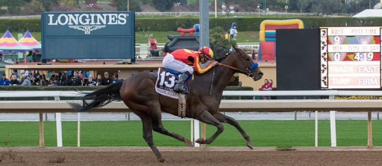 In his Southern California debut, Hronis Racing’s Gift Box was an impressive half length winner of the Grade II, $300,000 San Antonio Stakes under newly relocated Joel Rosario. In his first start for John Sadler, Gift Box was off at 6-1 in a field of nine 3-year-olds and up and paid $15.00 to win while covering 1 1/16 miles in 1:43.88. In the Grade II, $200,000 Mathis Brothers Mile (turf), Irish-bred River Boyne provided a formful result. Off as the 2-5 favorite in a field of 10 sophomores, he paid $2.80 to win with Flavien Prat up. Trained by Jeff Mullins and owned by Red Baron’s Barn, LLC and Rancho Temescal, LLC, he got the distance in 1:34.52.