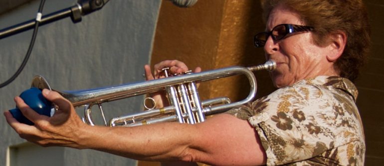 The band’s lead singer, Linda Vogel belts out the popular tunes with a full tone resonance that is rich and sweet. A few stand out songs that evening were … “All That Jazz” …we hear Jodi Gladstone croon the lyrics with honky tonk bold vocals as the band swings and bounces along. Nancy Peterson whips out her clarinet for a singular solo, adding to the flavor of old. An original song called “Sunny LA” swings with a contemporary, trendy sound while the guitar plays light and wispy and Linda Vogel basks us with her outstanding sunny, clear and solid vocals. When the legendary swing song “Jump, Jive, And Wait” is delivered The Great American Swing Band roasts the stage with all their talent. Jodi Gladstone and Linda Vogel are sensational performing a popping smoking-hot duet, the horn players rip off smoldering solos with a call and response that roll back and forth with lusty bravo. The guitar player and piano player soar. We are all jumpin and jivin with The Great American Swing Band on a sizzling summer night.